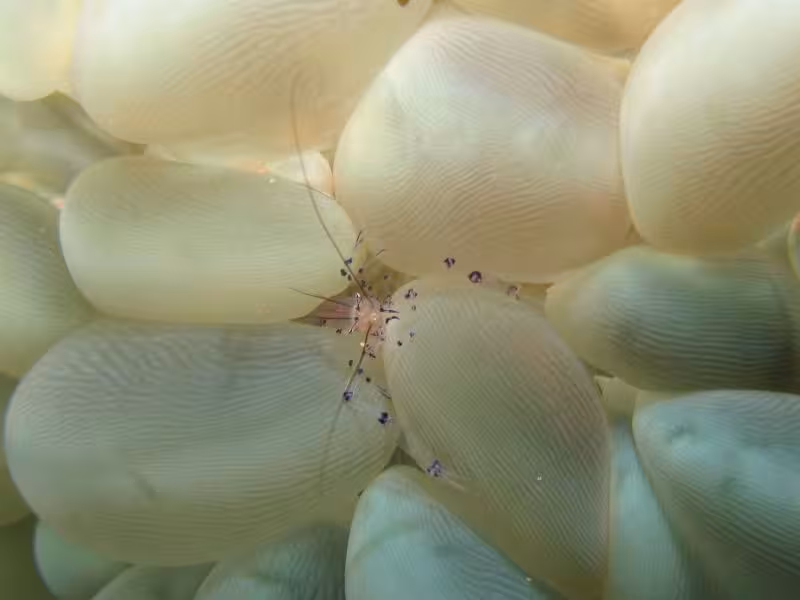 Der letzte Tag von Woche eins steht nochmal ganz im Zeichen von Makrozeug, Großes darf man vor Batanta nicht erwarten. (Reflections II) besteht im Wesentlichen aus einem sandigen, gemäßigt abfallenden Hang, auf dem vereinzelt ein paar Korallenblöcke stehen. In diesen tummelt sich allerlei interessantes Zeug, allen voran eine äußerst merkwürdig anmutende Platydoris-Nacktschnecke. Hinter einem Vorhang aus Glasfischen verbergen sich Gebänderte und Geringelte Seenadeln, Boxer Shrimps, Hohlkreuzgarnelen, Durban-Tanzgarnelen und eine Armee von Putzergarnelen, die auf den nächsten Kunden warten. Nach einiger Zeit geht der Sandhang in einen Korallenrücken über, dessen Erkundung wir uns für den 2. Tauchgang aufheben.