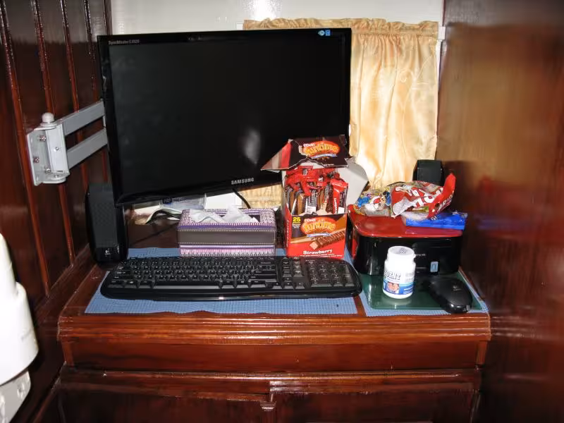 Zuerst ist aber mal Einkaufen angesagt, im Saga-Supermarkt statten wir uns mit dem Nötigsten aus, was man für eine zweiwöchige Tauchsafari so braucht: 2 Shorts, 3 T-Shirts, 3 Unterhosen, Zahnbürste, Zahnpasta, Duschgel, fertig. Bzgl. Tauchausrüstung herrscht Fehlanzeige, es gibt in Sorong keinerlei Tauchshops. Zum Glück gibt es auf der Mandarin Siren, unserer Herberge für die nächsten 2 Wochen, Leihausrüstung, wenn auch natürlich nicht alles in passender Größe vorrätig ist. Die vier Nummern zu großen Booties stopfe ich einfach mit den bei der Anreise getragenen, dicken Wintersocken aus, das passt dann schon. Neoprentechnisch sind nur Shorties vorhanden, die spare ich mir gleich ganz, bei 28 Grad Wassertemperatur wird in Shirt und Shorts getaucht. Die wichtigsten Ausrüstungsteile – Kamera, Computer und Automat – hatte ich eh im Handgepäck, sodass dem zweiwöchigen Tauchvergnügen nichts mehr im Weg steht. Zuerst genießen wir aber bei einem kühlen Bintang die warme Tropensonne auf dem Sonnendeck der Mandarin Siren.