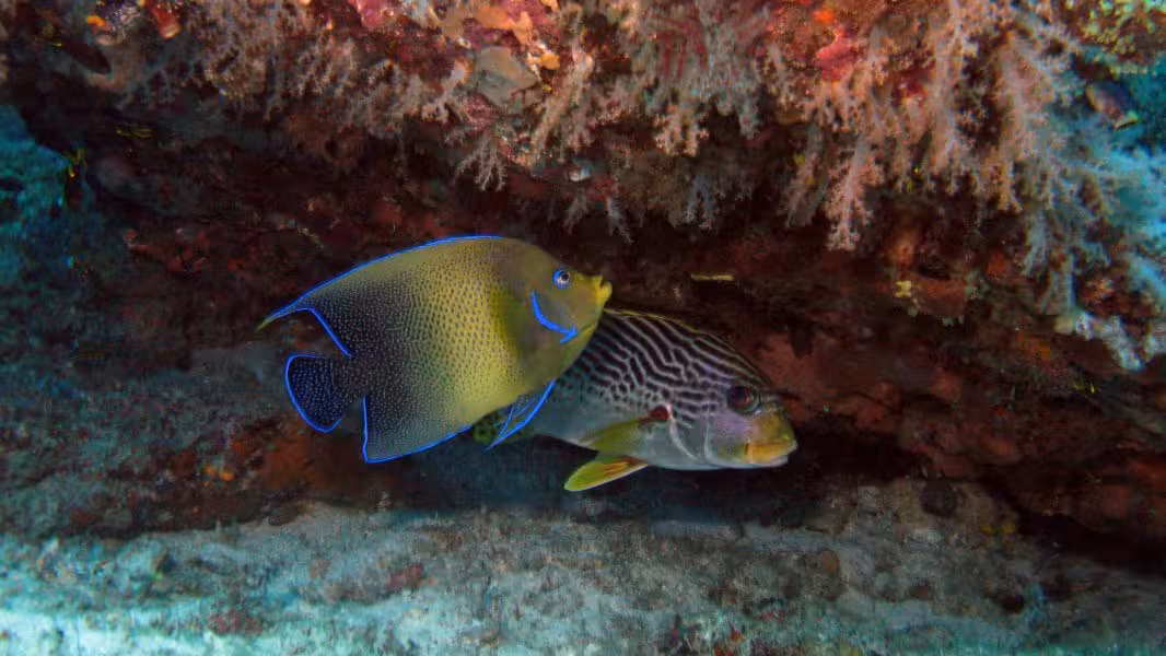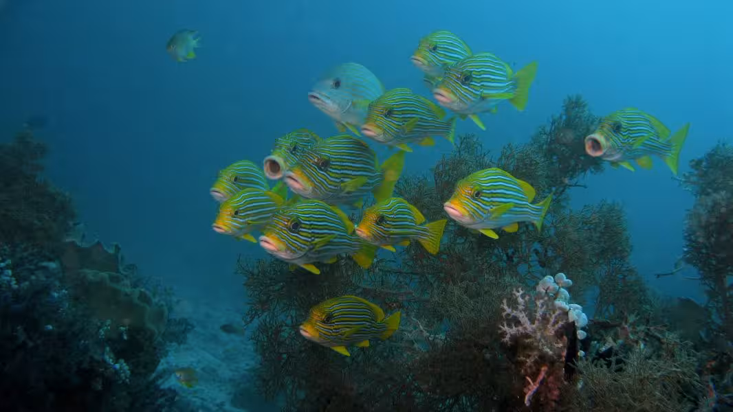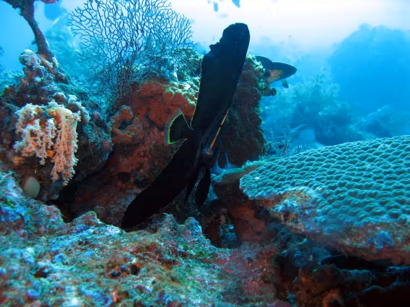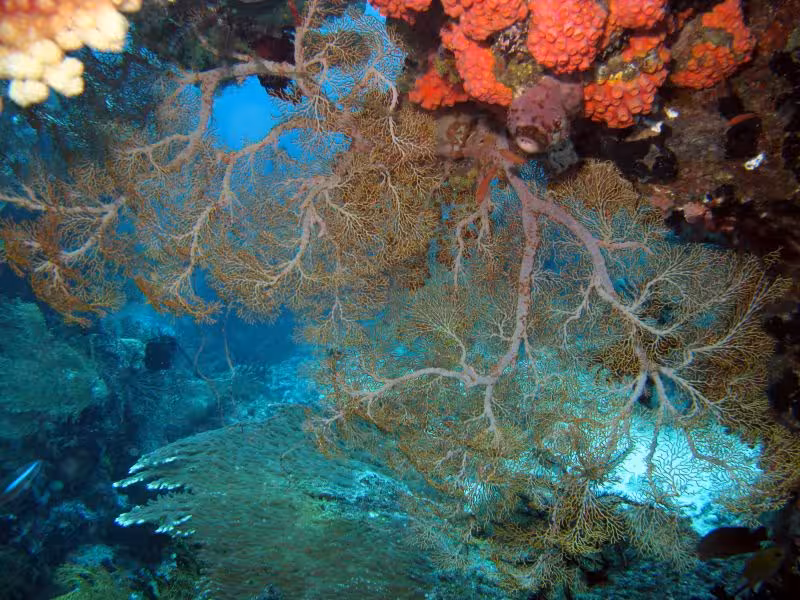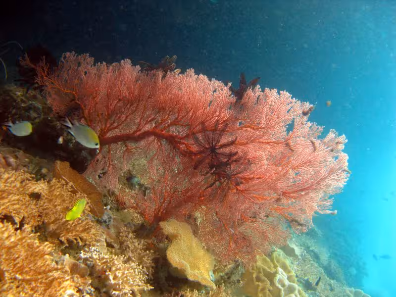 Das Gleiche gilt für Friwinbonda. An der Oberfläche schwirren hier ebenfalls riesige Sardellen-Schwärme umher. Eine Etage tiefer wartet eine schön bewachsene Steilwand, natürlich wieder mit von Pygmäen besetzten Gorgonien.