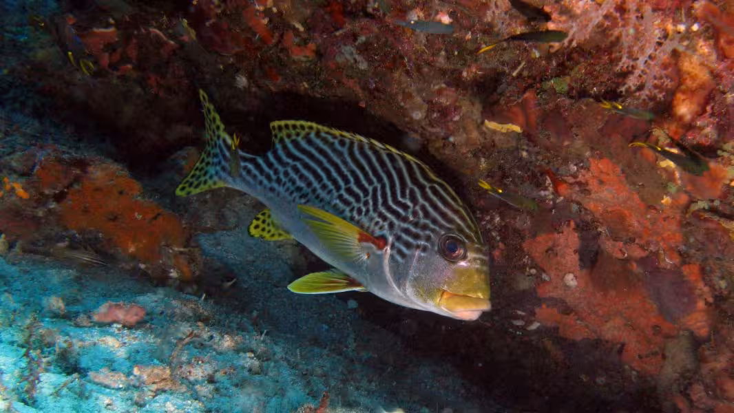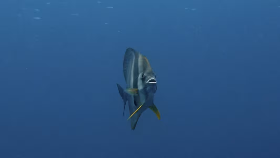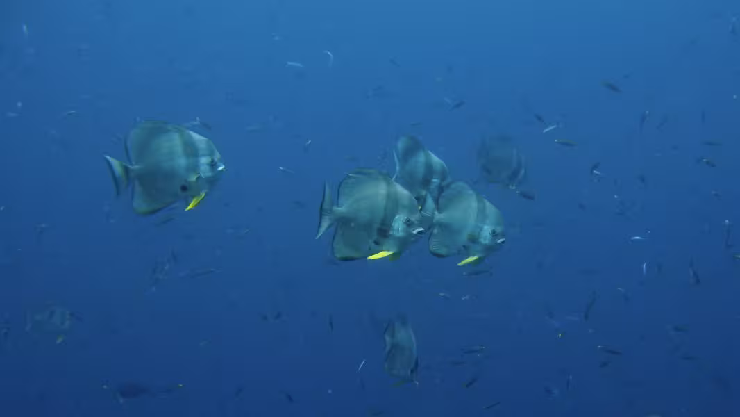 Zwei Stunden später geht es vor Yangeffo, das alternativ auch schon mal mit "Janggelo" oder "Yanggelo" bezeichnet wird, erneut ins Wasser, diesmal an der Citrus Ridge, im Kanal gelegen, der Yangeffo von Gam trennt. Der Tauchgang beginnt ruhig mit einer im Sand eingegrabenen Seegurke, die Deirdre ziemlich begeistert. Warum, ist mir bis heute nicht klar. Mich begeistert vielmehr der juvenile Fledermausfisch, der etwas genervt ins Blitzlichtgewitter stiert, das sofort über ihn hereinbricht. Wir folgen dem Rand des Zitronengrats, der als schön bewachsener Finger ins Meer hinausragt, und starren ins Blauwasser, vielleicht kommt ja was Interessantes vorbei. Zuerst erscheint eine Schule Fledermausfische auf der Bildfläche, die bald ziemlich zutraulich wird und uns folgt. Aus der Gegenrichtung kommt ein Schwarm Barrakudas auf uns zu und ich beschließe, ihm zu folgen. Es dauert nicht lang, da kommt wieder von vorne eine Schwarm Großaugen-Stachelmakrelen ins Blickfeld. Rechts die Fledermäuse, links die Makrelen, vor mir die Barrakudas und dazwischen überall die unvermeidlichen Hochrücken-Füsiliere, die zu Tausenden durch die Gegend schwimmen, garniert mit ein paar Regenbogen-Rennern. Man weiß gar nicht mehr, wohin man gucken soll. Ach doch, auf dem Riffdach gibt's ja auch noch was zu entdecken. Süßlippen warten zu Dutzenden an den Putzerstationen aufs Großreinemachen. Beim Ablichten eines Wobbegongs schwimmt mir eine Seekobra durchs Bild, der ich sofort auf ihrer Suche nach Nahrung folge. Die Kröte, die auf dem Weg zum Ausstieg dann noch unseren Weg kreuzt, finde ich schon fast nicht mehr erwähnenswert. Ein brillianter Tauchgang, mit Abstand der beste bisher auf dem Trip!