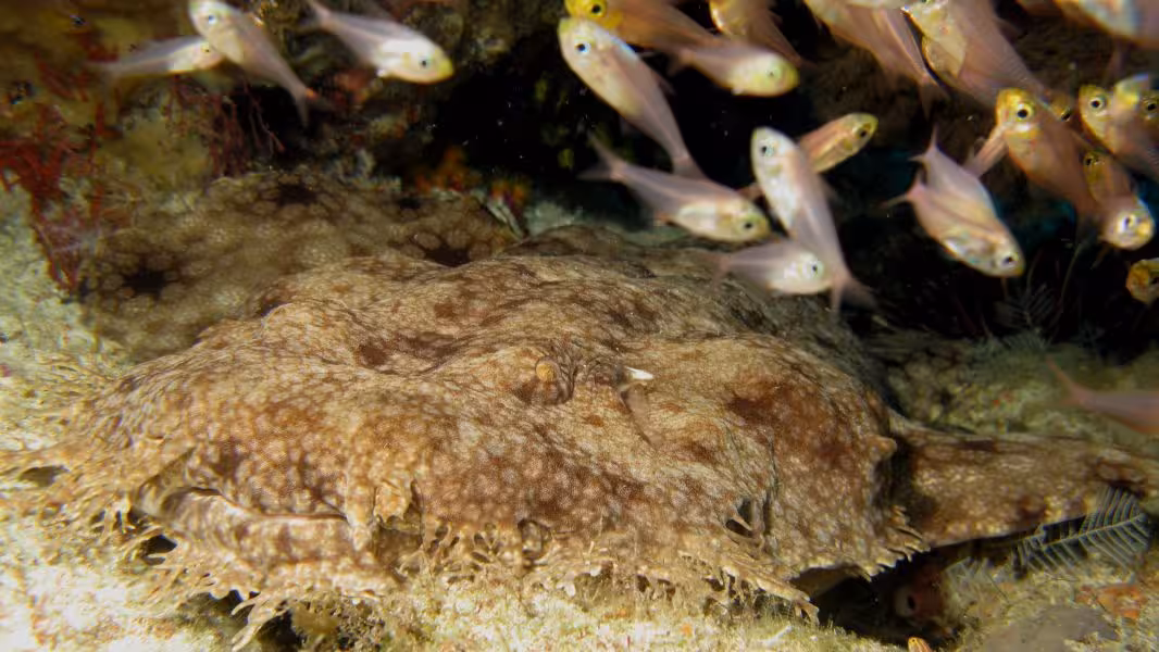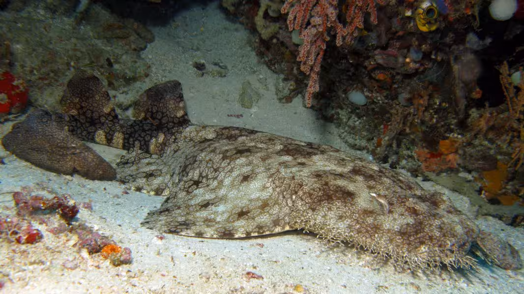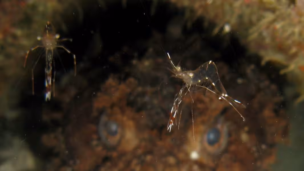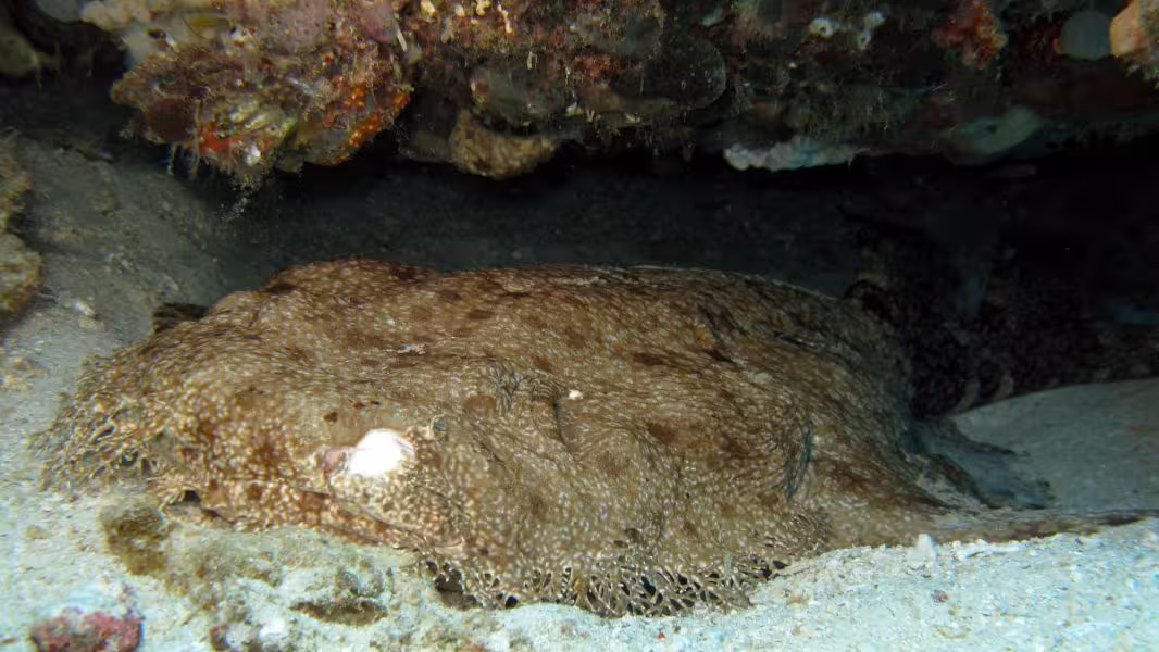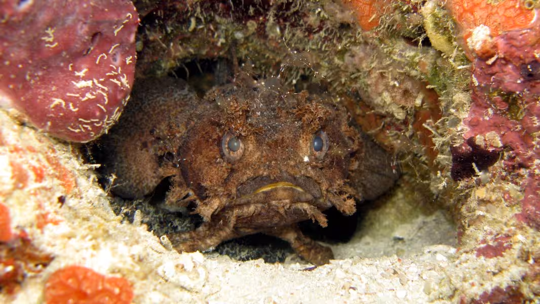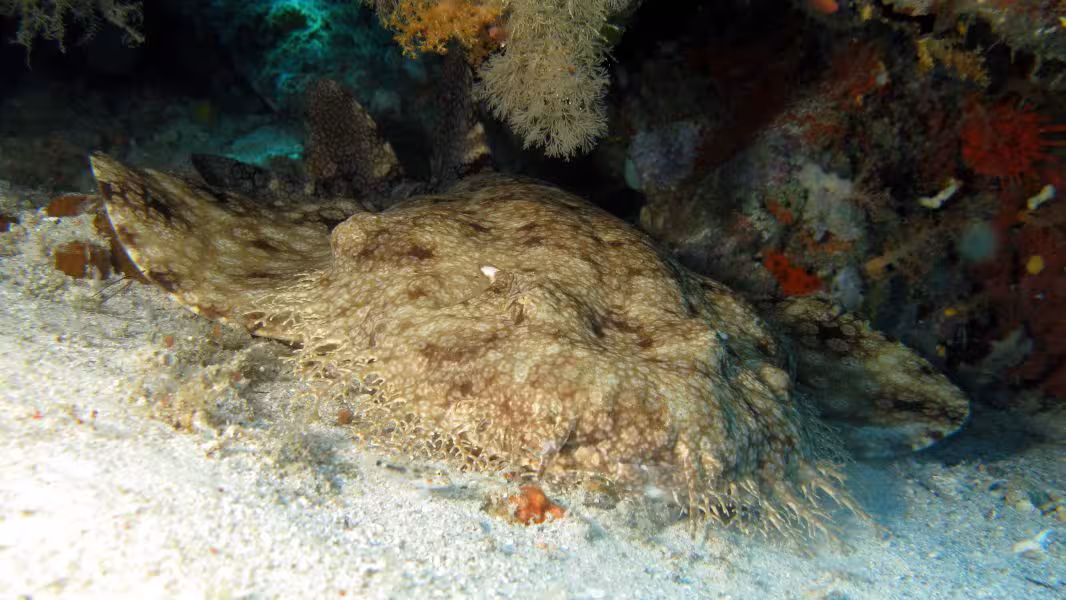 Die Gemüter abkühlen können wir 2 Stunden später. An Batu Laut geht es zum nächsten Tauchgang bei leichter Strömung, die uns in angenehmen Tempo über das unspektakuläre Riff schiebt, ins Wasser. Mal wieder Wobbegongs, das ist schon alles, was es zu diesem Lückenfüller zu sagen gibt. Mehr zu berichten gibt es von Roland's Woho. Deirdre hat dem Platz diesen Namen gegeben, weil sie schon bei zwei Nachttauchgängen hier ein merkwürdiges "Wohohoho" unter Wasser gehört und nicht die leiseste Ahnung hat, was der Verursacher gewesen sein könnte. Selbstverständlich hat keiner ihrer Mittaucher je das Geräusch gehört. Ob da doch etwas zu viel irischer Whisky im Spiel war? Oder etwas Tauchergarn? Was Roland mit all dem zu tun hat, konnte leider auch nicht geklärt werden. Ist auch egal, der Tauchgang verläuft ziemlich ereignisarm, bis Deirdre vor einem Loch hockend auf einmal völlig ausrastet. Sie muss irgendetwas Außergewöhnliches entdeckt haben. Tatsächlich sitzt in dem Loch ein großer Krötenfisch. Auch schon 11 Jahre her, dass ich das letzte Mal einen gesehen habe, am Navy Pier in Exmouth. Noch besser ist, dass der Fisch mit den großen Augen auf seiner frisch geschlüpften Brut hockt, die fröhlich unter ihm hin und her springt. Wie Gardesoldaten bewachen ein paar freischwebende Garnelen den Eingang zur Höhle. Vielleicht sind sie aber auch nur der Kröte nächstes Frühstück, wer weiß das schon!? Deirdre ist jedenfalls voll aus dem Häuschen, weil sie noch nie einen Krötenfisch gesehen hat und gar nicht weiß, was das für ein merkwürdiger Fisch ist. Ich bin auch ganz hin und weg, wäre aber noch glücklicher gewesen, hätte ich diesmal den Epaulettenhai gesehen, der wieder dem anderen Buddy-Team vorbehalten bleibt. Nichtsdestotrotz rundet der Nachttauchgang einen gelungenen Tag ab.