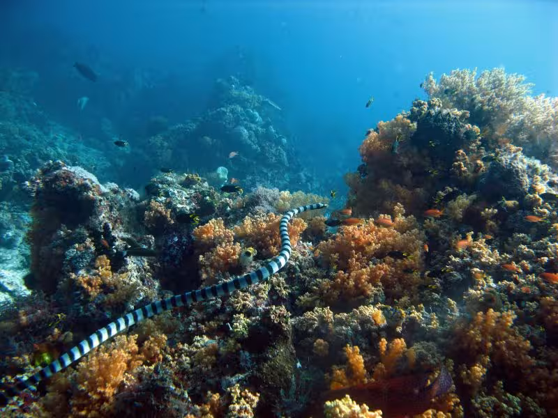 Nach dem actiongeladenenen Tauchgang vom Vormittag geht es nachmittags an der Gam Ridge etwas ruhiger zur Sache "Easy Diving" ist angesagt. Die Kleintierfans erfreuen sich an den Hohlkreuzgarnelen, ansonsten gibt es außer einem Wobby, einem niedlichen kleinen gelben Kofferfisch und einer Seeschlange, die durchs Riff streunt, nichts Nennenswertes zu berichten.