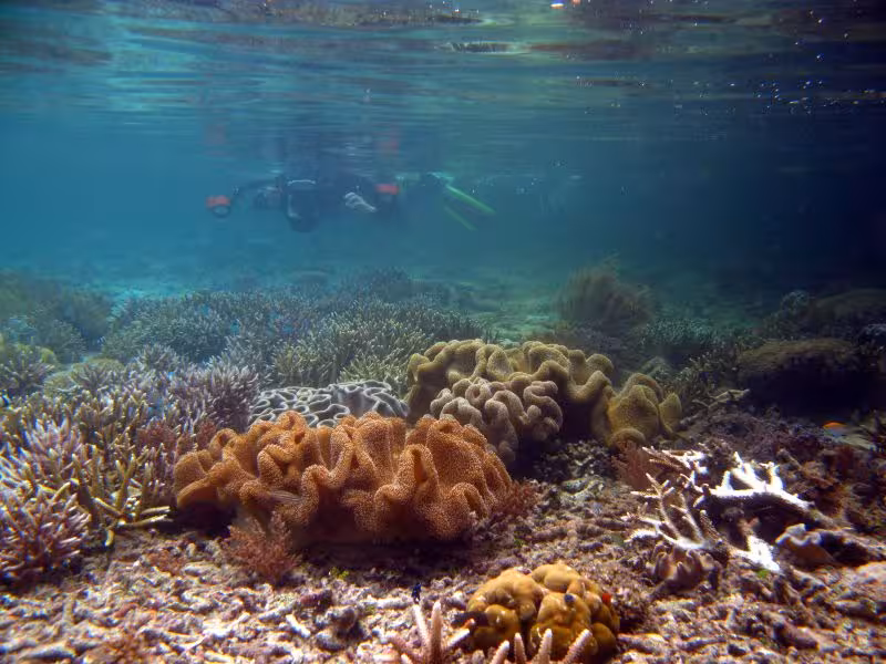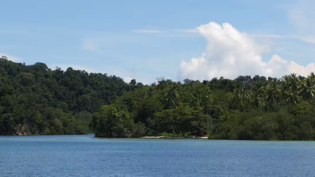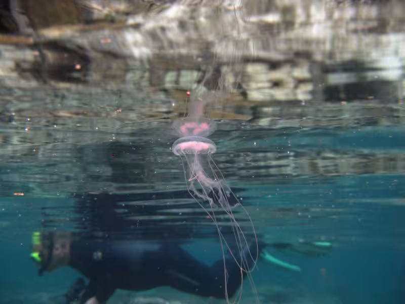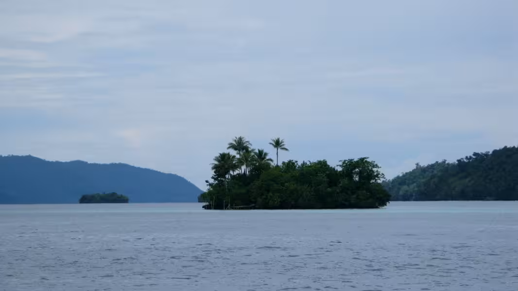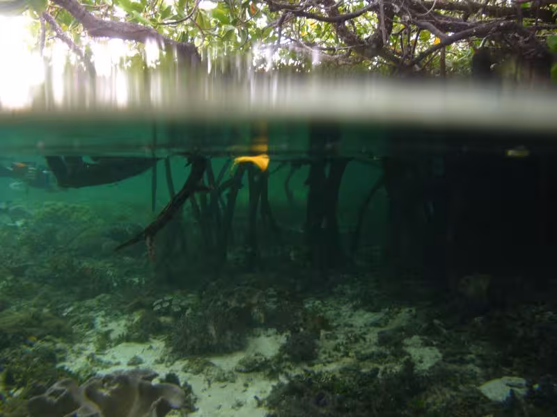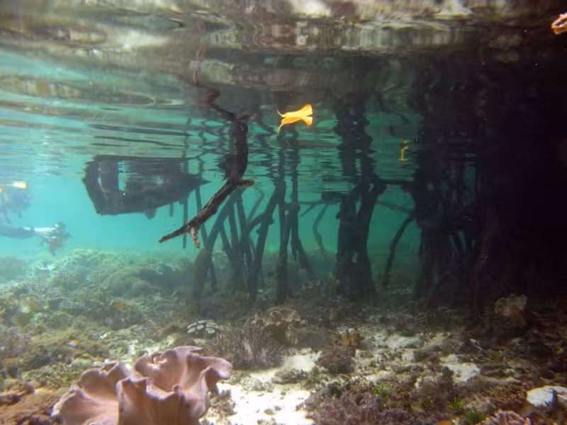 Für die Adrenalinjunkies unter uns ist anschließend Schnorcheln angesagt. Nun ist Schnorcheln keine Aktivität, bei der ich mir grundsätzlich in die Hose mache. Wenn man aber am Rande des Mangrovenwaldes von Gam schnorchelt, der das Zuhause von Leistenkrokodilen ist, sieht die Sache schon etwas anders aus. Der letzte Angriff auf einen Schnorchler ist angeblich einen guten Monat her und ging zum Glück glimpflich aus. Bevor es ins Wasser geht, werden wir noch instruiert, nicht in die Mangroven hineinzuschwimmen, da man sich dort sehr leicht verfangen kann, und unsere Flossen nur minimal einzusetzen, um Wasserplatschen zu vermeiden. Man muss ja nicht unnötig das Interesse der Krokos wecken. Solange die Sonne hoch am Himmel steht, bleiben sie ansonsten im kühlenden Schatten der Mangroven und verlassen erst bei Einbruch der Dämmerung ihren Unterschlupf. Ich hoffe, die Krokos wissen das auch und machen heute keine Ausnahme. Und wofür das Ganze? Mangroven sind auch die Kinderstube zahlreicher Fischarten, die hier im schützenden Dickicht und Wurzelgewirr ihre Eier ablegen. Demzufolge kann man hier viele Jungfische der Arten sehen, die man ansonsten nur im Erwachsenenalter am Riff zu sehen bekommt. Die Schnorchelei verläuft dann auch wie geplant, der Jungfisch ist vorhanden, die Krokos bleiben uns vom Leib und nach einer knappen halben Stunde sind wir rechtzeitig vor Einbruch der Dämmerung wieder aus dem Wasser. Nur die Quallenarmee, die sich in der Bucht breit gemacht hat, verleidet uns etwas das Schnorcheln, zurück an Bord der Mandarin Siren ist exzessiver Essigeinsatz angesagt.