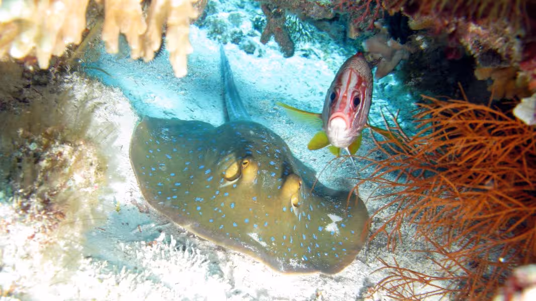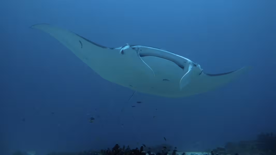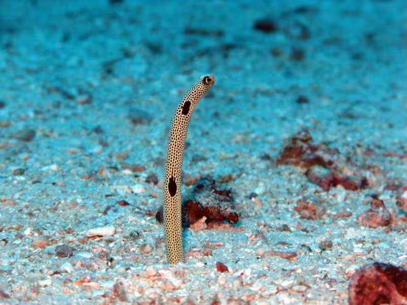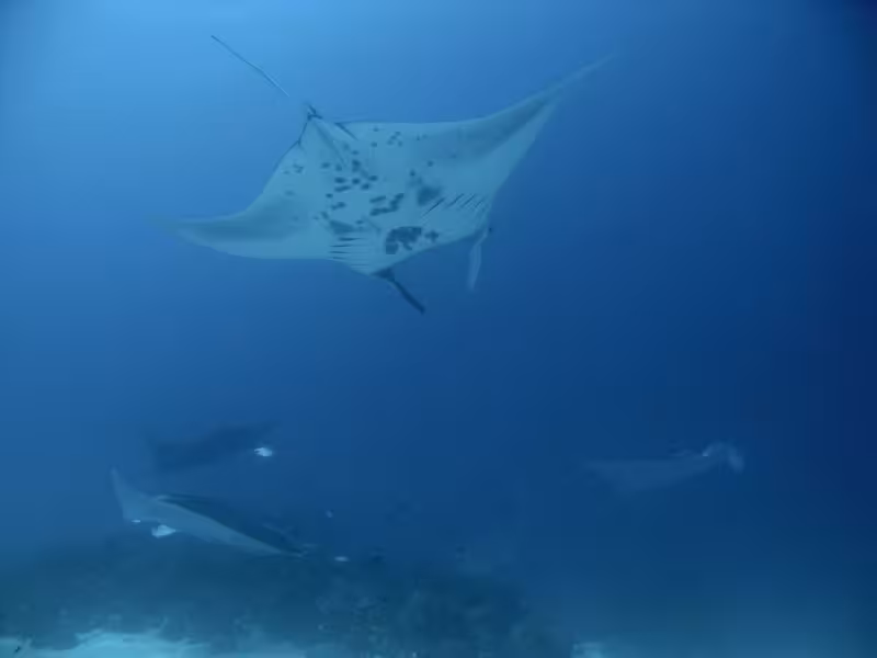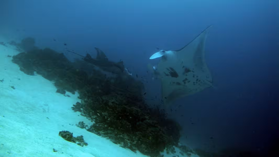Strahlend blauer Himmel begrüßt uns am nächsten Morgen, ein guter Start in den Tag, auf den Detlev schon die ganze Zeit gewartet hat. Wenn alles gut läuft, werden wir uns heute an Manta Sandy mit einem oder mehreren der teuflischen Rochen vergnügen. Damit das auch für die Rochen ein Vergnügen wird, gibt's vorher wieder ein ausführliches Briefing: Abstand halten, nicht die Putzerstationen besetzen, nicht Grabschen (was eigentlich selbstverständlich sein sollte), nicht mit den Flossen durch den Sandboden waten, da lebt nämlich auch einiges. Voller Vorfreude springen wir ins Wasser und sehen – nichts. Kein Manta weit und breit, weswegen wir erstmal das angedrohte Leben im Sand beäugen. Ein einigermaßen seltener Blauer Kieferfisch lugt aus seiner Wohnröhre und zieht sich bei Annäherung immer zurück, was das Beäugen etwas schwierig gestaltet. Gleiches gilt für die nebenan hausenden Röhrenaale. Weniger scheu sind die zwei nur wenige Zentimeter großen Zwergnadelpferdchen, die man leicht übersieht, weil sie festgeklammert an kleinen Steinen kaum von selbigen zu unterscheiden sind. Cool bleibt auch die bizarre Flügel-Seenadel, der ich bisher erst einmal begegnet bin – natürlich in Lembeh. Als ich versuche, einen Wobbegong möglichst fotogen zu Pixel zu bringen, sind schon 40 Minuten Tauchzeit vergangen. Dann endlich tauchen sie auf, ein komplett schwarz gefärbter "Black Manta" fliegt an mir vorbei, gefolgt von seinem Kollegen mit der Standardfärbung auf dem Rücken, im Englischen "Chevron Manta" genannt. Sofort ist Stellungswechsel angesagt, im Halbkreis positionieren wir uns um die Putzerstation und schauen dem Treiben zu. Weitere Mantas kommen angeflogen, reihen sich in die Schlange ein und warten, bis sie dran sind. Am Ende kreisen fünf Mantas um die Putzerstation, denen wir noch eine knappe Stunde lang zuschauen, bis wir nach 90 Minuten mit dem letzten Rest Luft in der Flasche das Wasser verlassen. Sehr geniale Geschichte, die Angelegenheit.