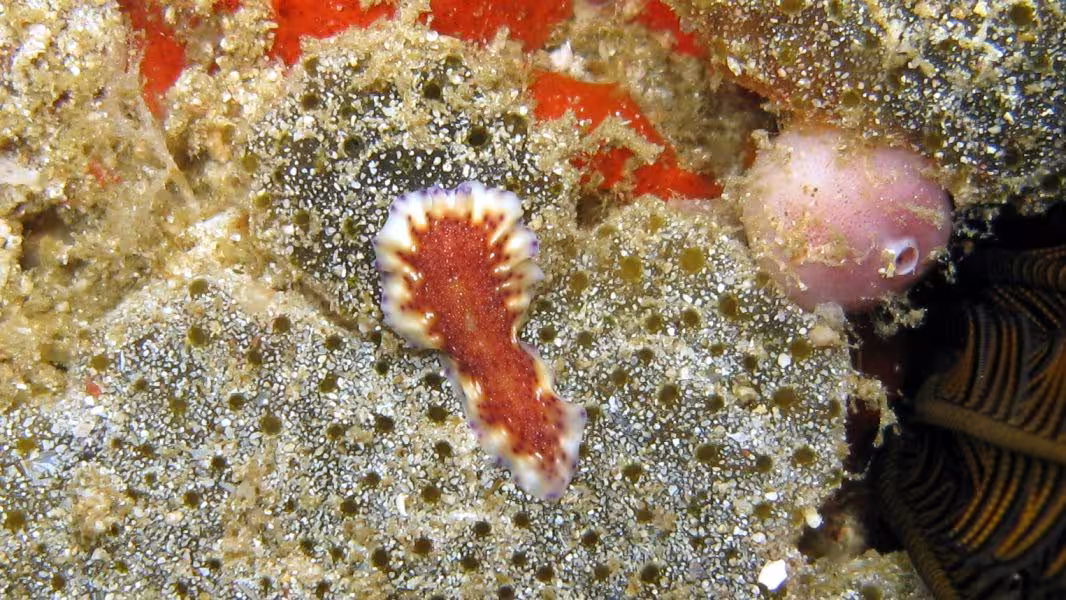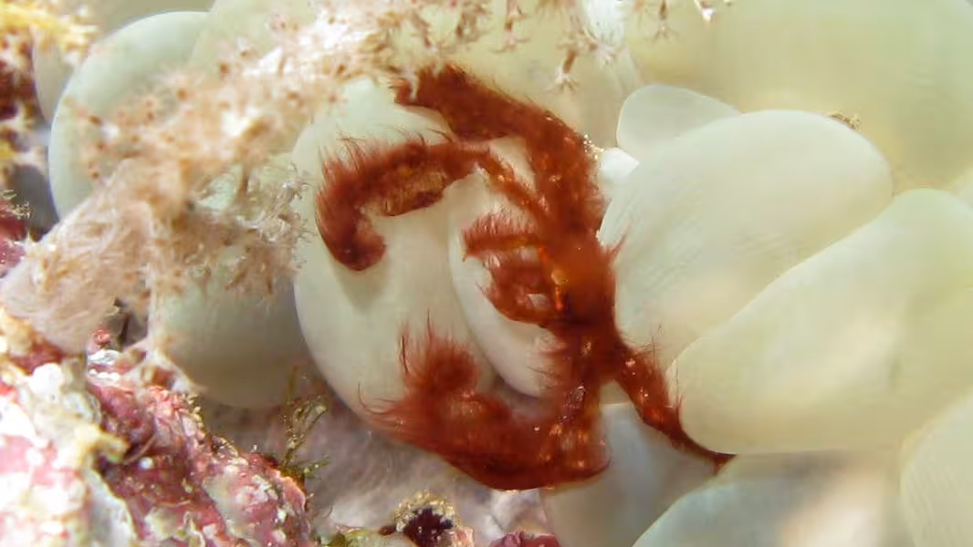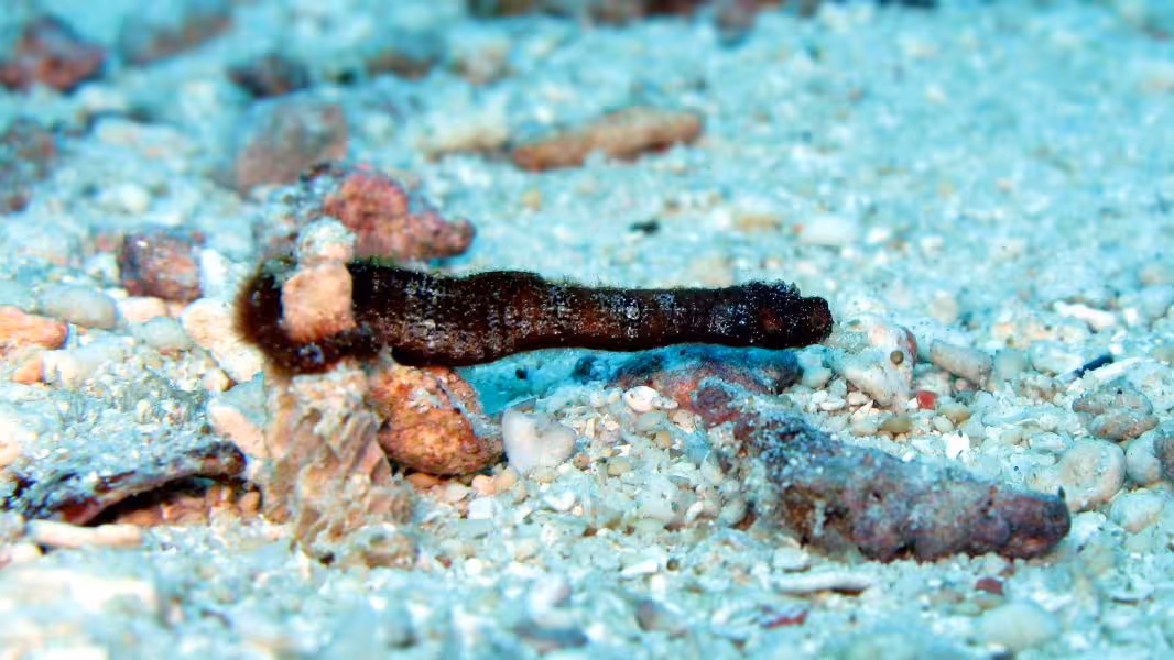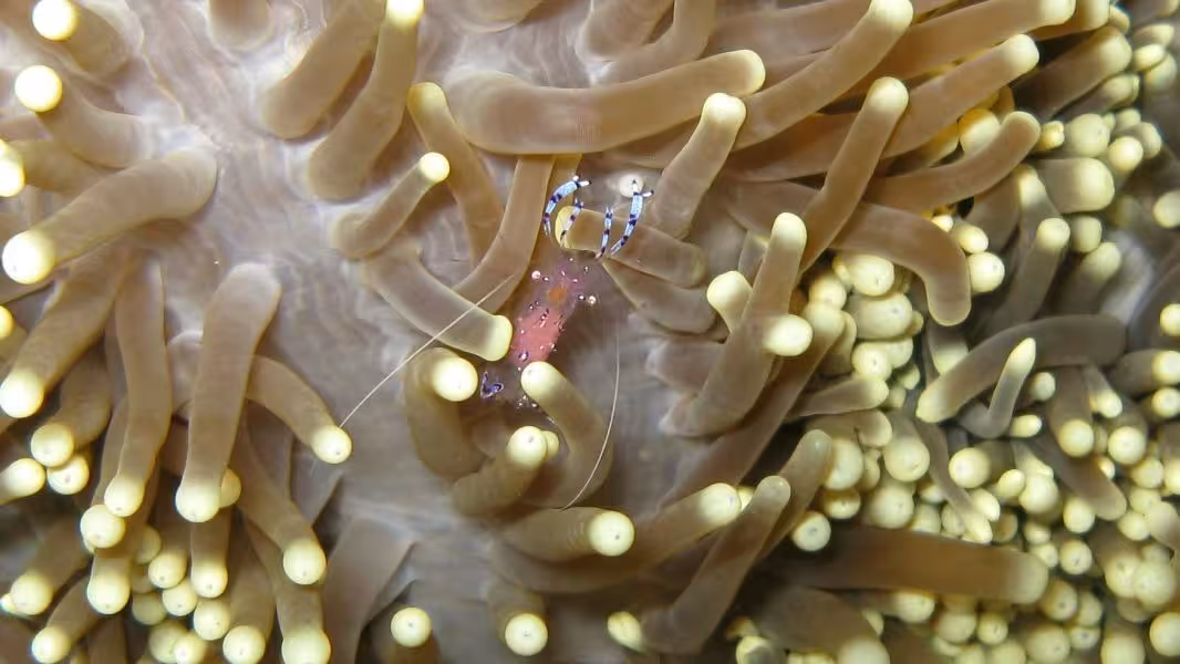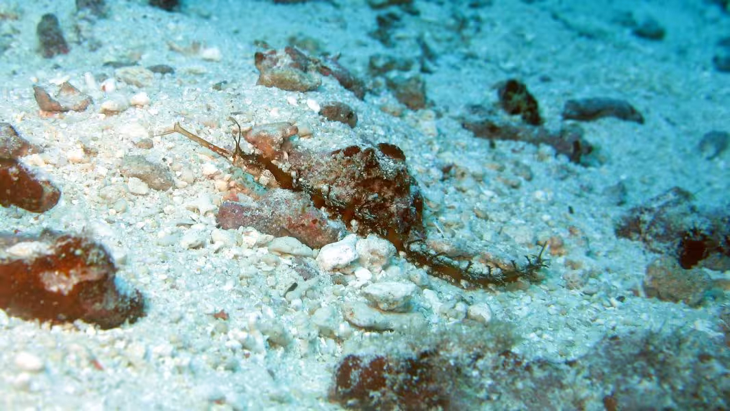 Der dritte und letzte Tauchgang heute findet ebenfalls in bekanntem Terrain statt, an Sardine steht ein Dämmerungstauchgang auf dem Programm. Auch dieser Tauchgang mutiert zum Makro-Tauchgang, Großes ist nicht zu sehen. Auch Kleines kann mich aber durchaus begeistern, insbesondere, wenn es sich um eine winzige, kaum als solche zu erkennende Baby-Sepia handelt, weniger als einen halben Zentimeter groß, zu klein für meine Kamera. Das Ablichten wird auch noch dadurch deutlich erschwert, dass der Mikro-Cephalopode meine Kamera liebgewinnt, auf meinen Blitzarm klettert und durch nichts dazu zu bewegen ist, da wieder runterzukommen. Nach einigen Versuchen schaffe ich es dann doch, ihn vorsichtig runterzuschubsen. Er hockt sich auf einen kleinen Stein und was sehe ich da? Da sitzt sein Bruder, der nochmal nur halb so groß ist wie er selbst. Diese beiden Zwerge retten einen ansonsten recht ereignislosen Tauchgang.