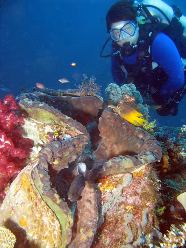 Damit ist der Tag aber noch nicht zu Ende, es folgt noch ein Nachttauchgang an der benachbarten Yangeffo Ridge. Außer einer Disco-Muschel sehe allerdings nicht viel, da kurz nach unserem Sprung ins Wasser die Strömung rasant zunimmt und uns in atemberaubender Geschwindigkeit über das Riff jagt und ich mehr damit beschäftigt bin, allen Hindernissen auszuweichen, die im Schein der Lampen vor uns auftauchen. Nichtsdestotrotz schafft es Deirdre selbst noch unter diesen Bedingungen (Nacht plus fette Strömung) in einer Gorgonie ein Bargibanti-Pygmäenpferd zu entdecken! Keine Ahnung, wie sie das macht.