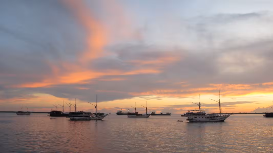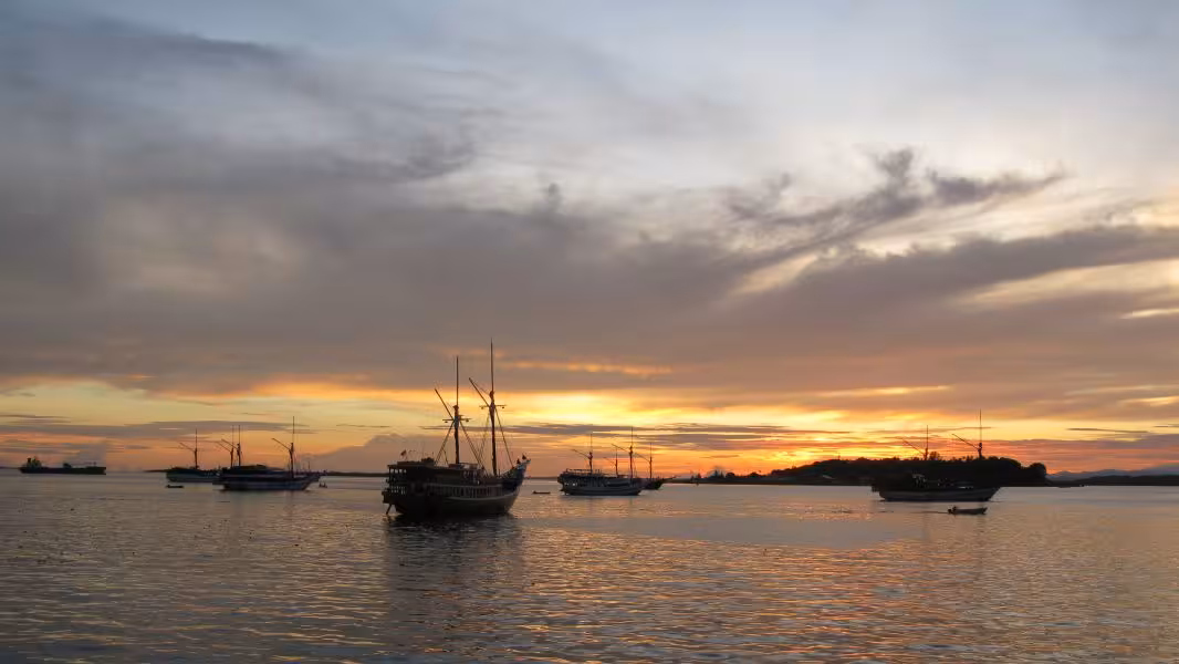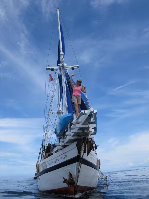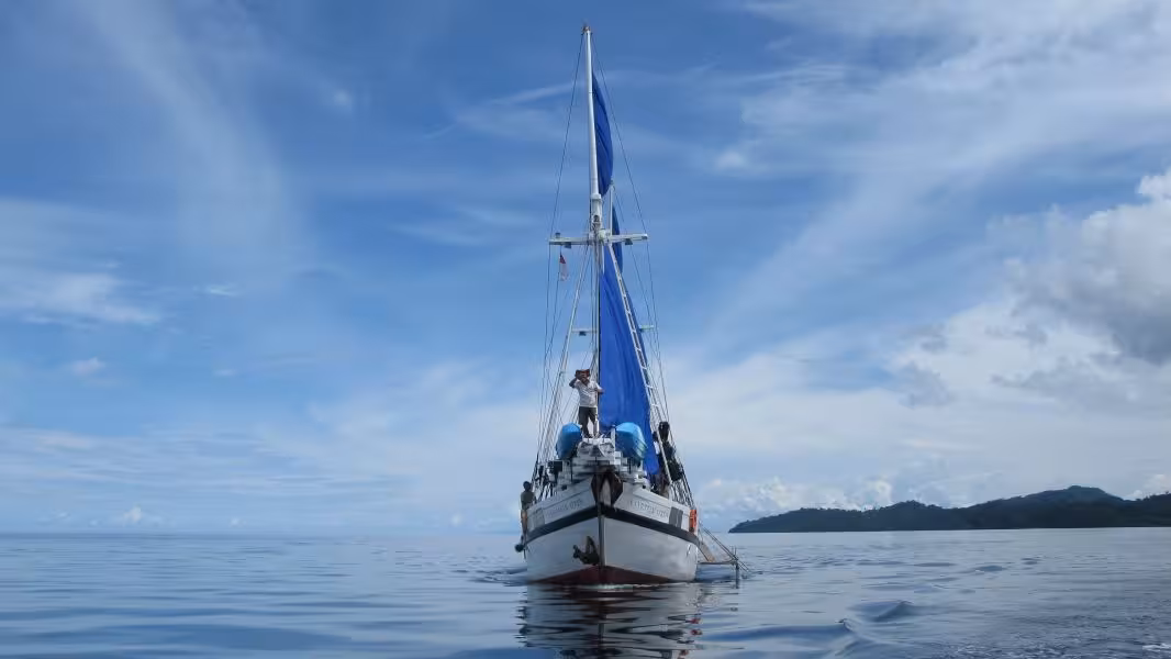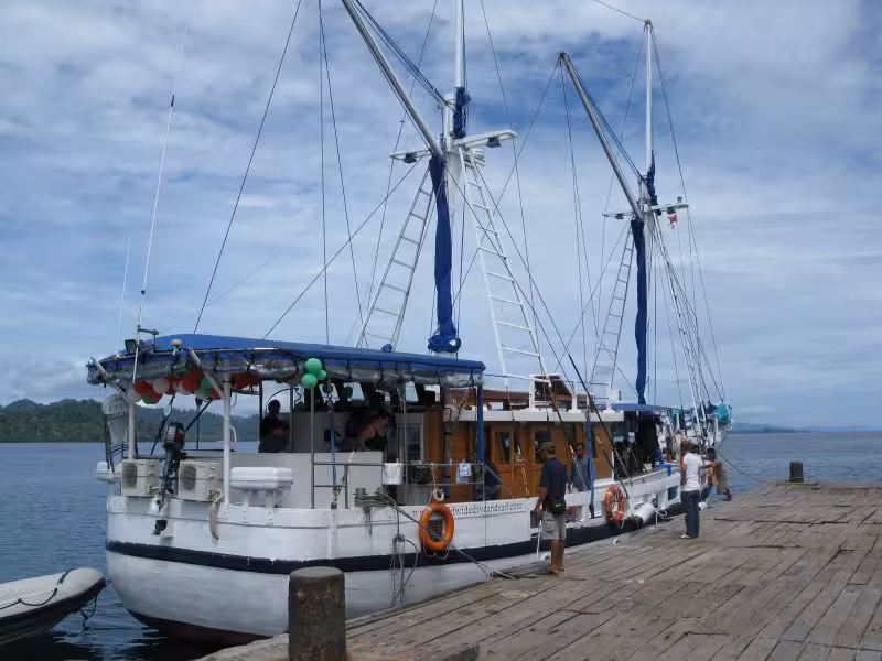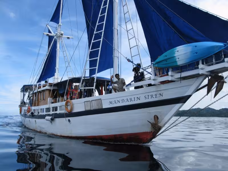 Auf dem Weg zurück nach Sorong bewegt uns das schöne Wetter, mal nach Segelhissen für ein paar Show-Fotos zu fragen. Gerne kommt die Crew der Bitte nach, die blauen, aber völlig nutzlosen "Segel" machen sich gut als Kontrast zum weißen Rumpf der Mandarin Siren. Mit dem Schlauchboot drehen wir ein paar Runden und lichten den Kutter von allen Seiten ab, bevor die Fahrt weiter geht und wir am späten Nachmittag bei kompletter Flaute mit vollen Segeln in Sorong einlaufen. Dort bringen wir den Abend mit ein paar Bierchen auf dem Sonnendeck zu und ziehen ein Fazit über das Gesehene und Erlebte. Der Tenor ist eigentlich bei allen ähnlich: eine insgesamt tolle Tour, mit Abstrichen in dem ein oder anderen Punkt: Dem einen fehlten die Fischschwärme im Süden, dem anderen mit Ausnahme der Mantas der Großfisch (voher evtl. nicht richtig informiert?) und wieder anderen (und dazu gehöre ich auch) die außergewöhnlichen "Critter", die man nicht alle Tage sieht. Merkwürdigkeiten unter Wasser habe ich in Lembeh deutlich mehr gesehen. Der Rest war prima, auch ohne viele Critter hatten wir tolle Tauchgänge, Crew, Koch und Tauchbetrieb verdienen sich Bestnoten und bis auf die Probleme mit der Wasserpumpe war auch das Boot sehr gut. Von daher lautet mein Urteil: Raja Ampat, gerne wieder, gerne auch wieder mit der Siren-Fleet, jedoch mit weniger Erwartungen an Critter und stärkerem Fokus auf die Tauchplätze im Norden rund um Waigeo.