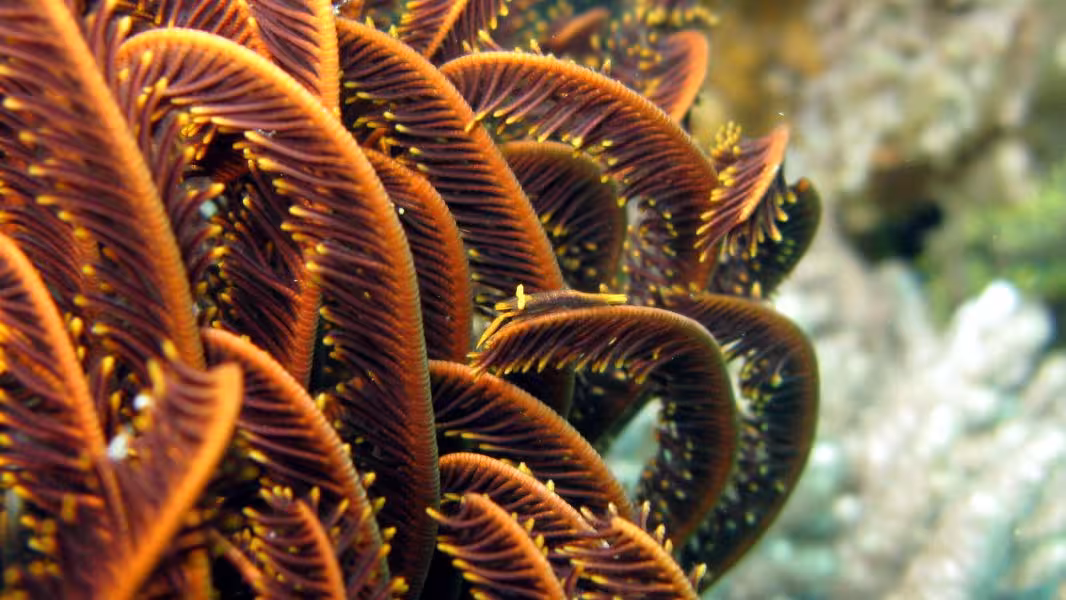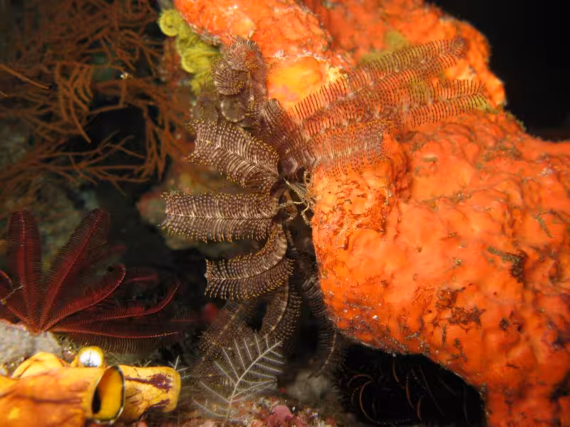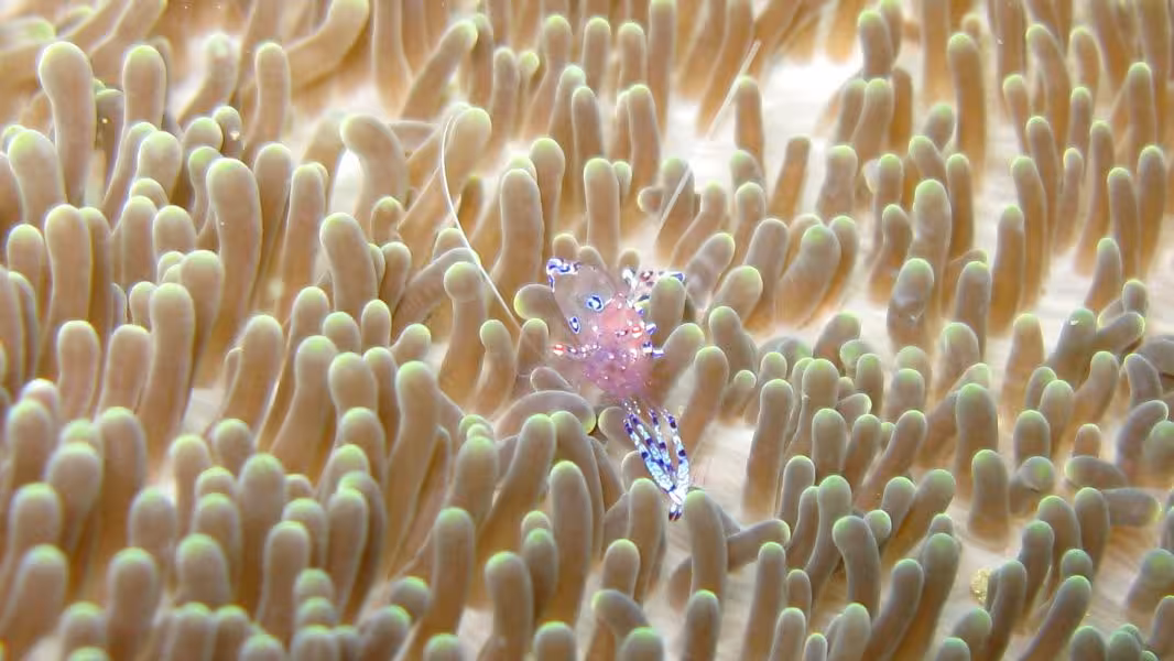 Nach dem Auffüllen der Tanks geht es schließlich weiter. Da die Stunde schon etwas fortgeschritten ist, werden wir es heute nur noch auf zwei weitere Tauchgänge bringen. Nach dem klasse Sunset-Dive von gestern versuchen wir es erneut an Mioskon. Der Platz präsentiert sich jedoch ganz anders als gestern, die Sicht ist schlecht, große Fischschwärme sind nicht zu sehen. So konzentrieren wir uns diesmal auf Kleinzeug, was sich natürlich auch hier im Riff findet. Neben den Seenadeln sind die kleinen, in Federsternen versteckten Garnelen und die Orang-Utan-Krebse meine Favoriten. Was Großes gibt's auch noch zu sehen: Ein Wobby liegt, den Kopf in einer Höhle vergraben, herum, und zeigt der Wobby-Damenwelt, was er zu bieten hat. Groß ist auch der Hundezahn-Thunfisch, der mir am Ende des Tauchgangs noch im Blauwasser über den Weg schwimmt.